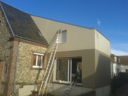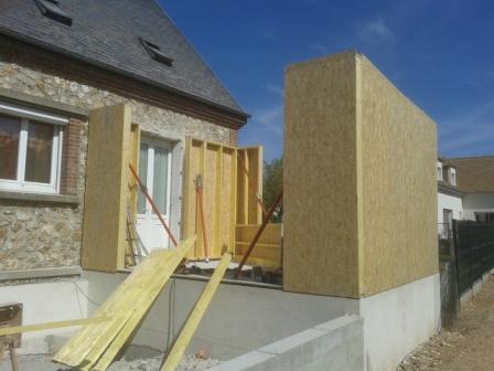 Chantier de construction d’un agrandissement de maison construit en hors d'eau, hors d'air. Fabriqué en ossature bois et recouvert d'un bardage de couleurs .